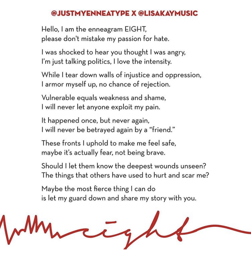 Say what you will about the enneagram (yes, I know it has secular origins), but over the past year or so, I’ve found it to be a very helpful tool in understanding myself. Acknowledging that I am an 8 helped me to name destructive tendencies in my life that came from places of fear so that I can let God redeem the beautiful parts of my personality.