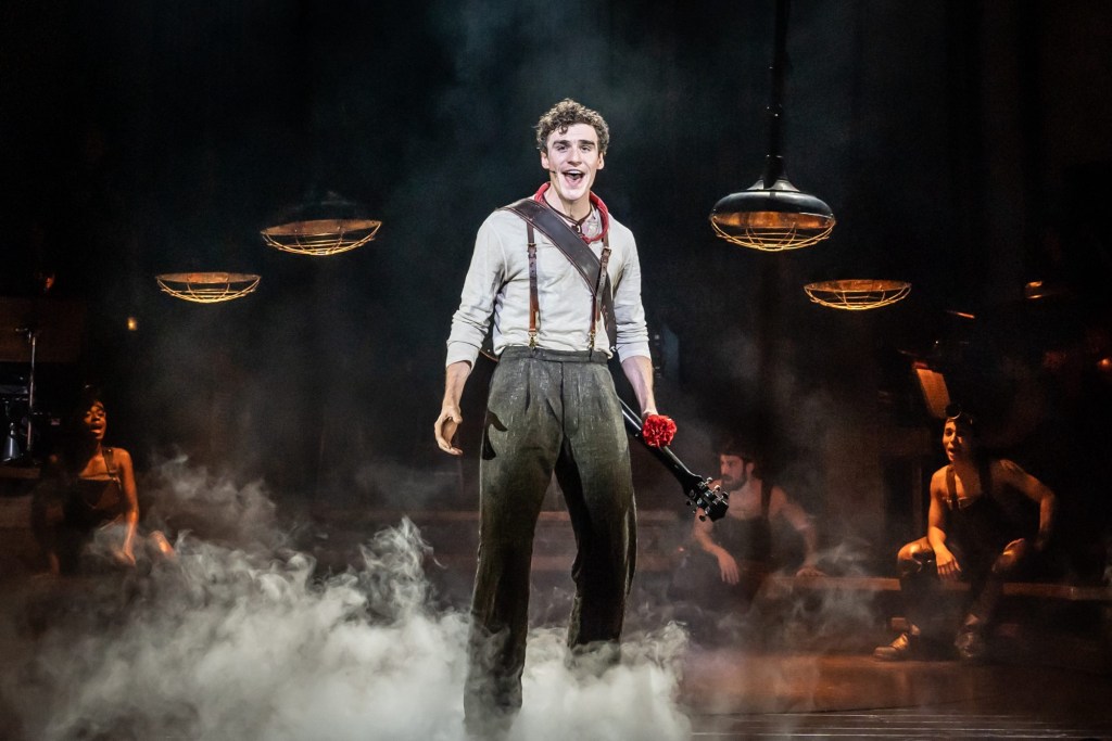 Lest you hear Greek myth and think of togas, columns, and lyres, the show is set in an ambiguous time and place, and the music is a folksy jazz style. It’s Depression-era inspired, but Eurydice has that grunge look of the 90s/00s, Hermes (the storyteller) wears a clean cut sharp silver suit that would look at home in the 50s/60s. Hades wears a pinstriped suit of a railroad tycoon in the 20s/30s, and Persephone’s dress might be mistaken for that of a 40s club singer or Dolly Parton. The Chorus would look at home a hipster Portland coffee shop/brewery. From the beginning trombone notes, your feet are tapping and your head is bobbing as you’re invited into the rustic bar scene. When Orpheus brings out his electric guitar, you’re swept away by the romance and yearning that calls you home, the feeling both familiar and strange. Then, when the stage expands as Hades and Persephone descend back to the Underworld, you’re almost blinded by the unnatural brightness and feel the pounding of the syncopated industrial beat in “Chant”.